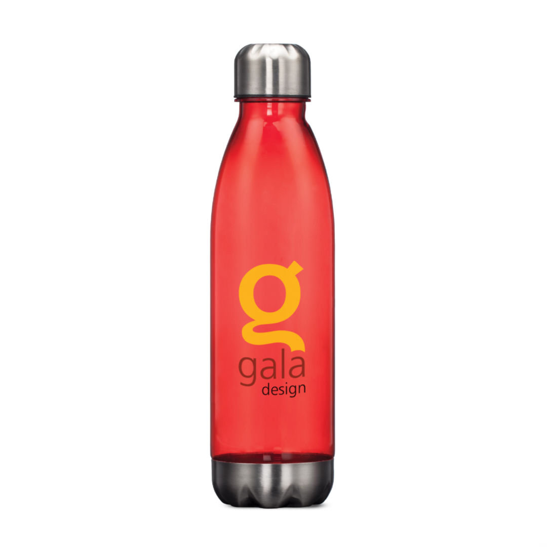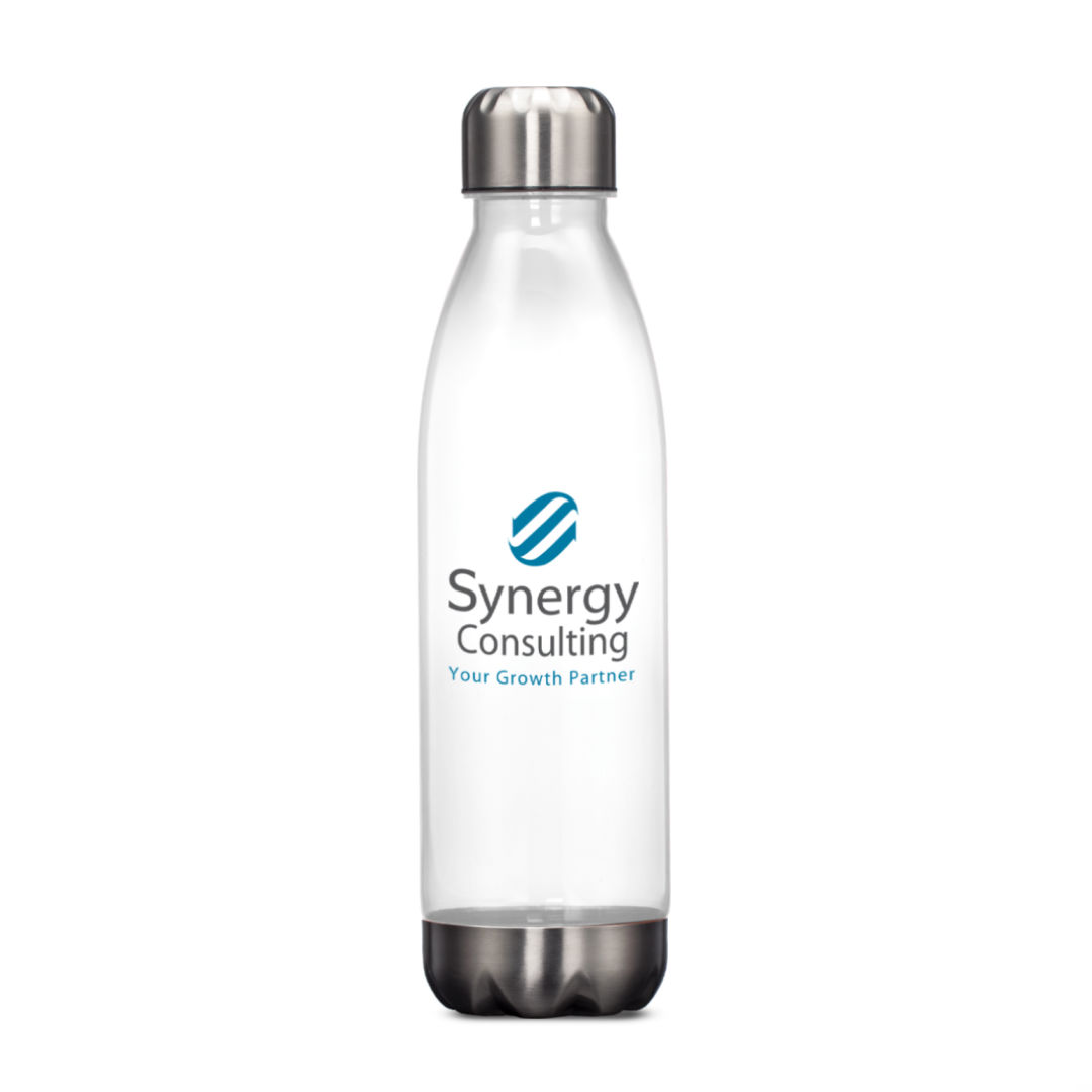 Translucent AS water bottle- Stainless steel accent base and lid- Screw on, spill-proof stainless steel lid. 2.75″ W x 10.37″ H