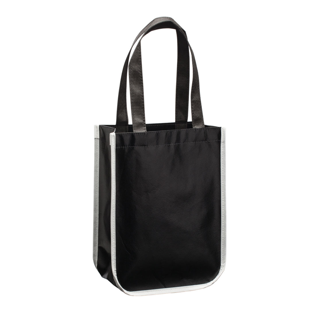 Durable fabric construction- 70 gram non woven and 30 gram laminated non-woven polypropylene- Contrast color side panelsProduct Size: 9″ x 12.25″ x 4.25″. 9.0″ W x 12.25″ H x 4.25″ D