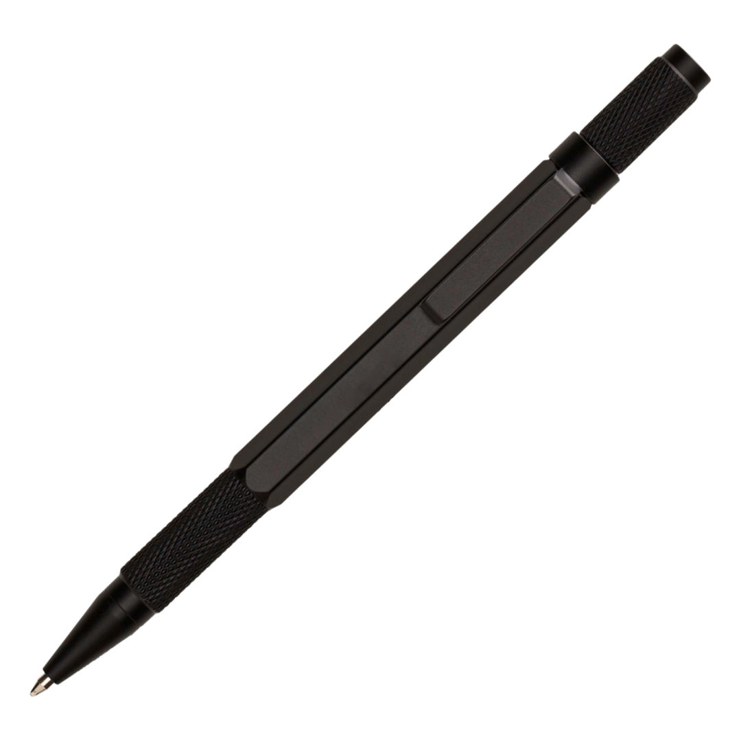 Metal twist-action ballpoint pen with satin silver or black trim and textured grip.