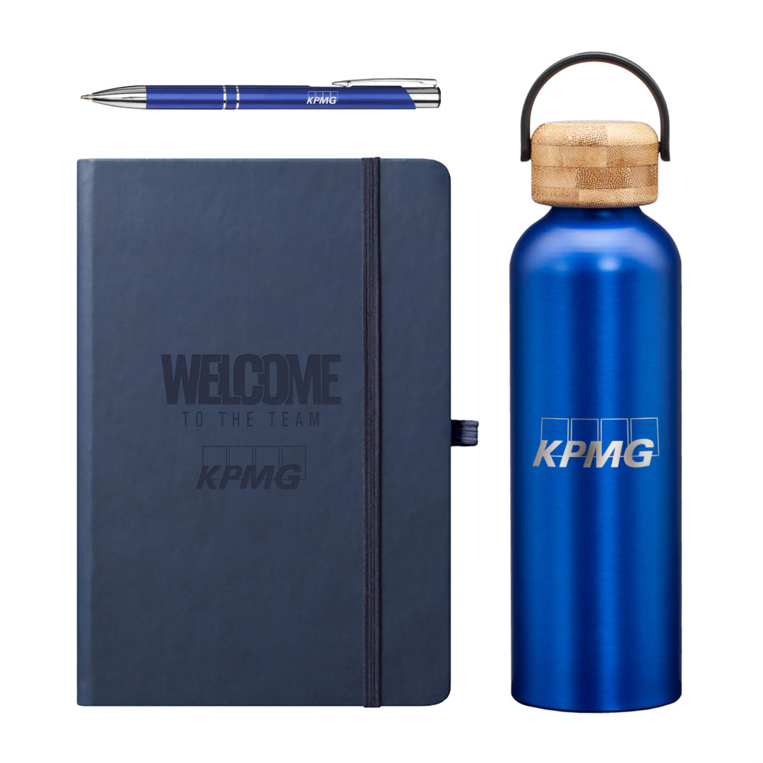 The Starter Onboarding Set is the perfect way to welcome new hires with thoughtfully selected essentials. It features our best-selling Greenstone Bottle for all-day hydration, the stylish Eccolo Cool Journal for ideas and notes, and our reliable Clicker Pen for effortless writing. Designed to combine practicality and style, this set ensures new team members feel valued from day one. Branded and beautifully packaged, it’s the ideal introduction to your company culture.