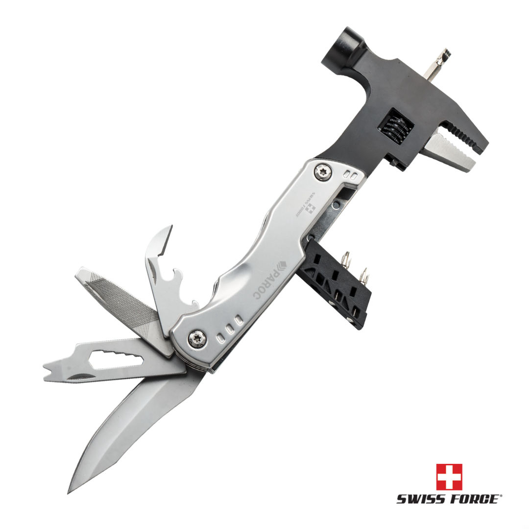 Stainless steel hammer and wrench multi-tool- Functions include: adjustable wrench, hammer, 3 bits, can opener, nail file, knife, flat screwdriver and fish hook remover – Packaged in a stylish Swiss Force EVA insert gift boxProduct Size: 3″ x 7″. 3.0″ W x 7.0″ H