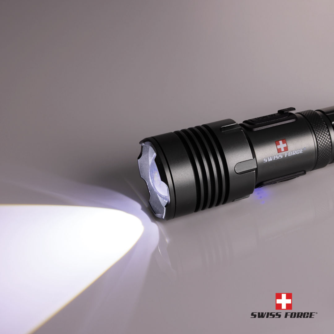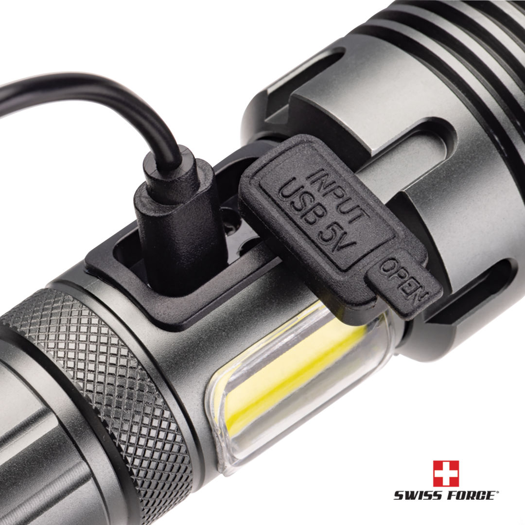 The Swiss Force® Rimac Aluminum Rechargeable Flashlight delivers powerful 400-lumen brightness in a compact, lightweight aluminum design. Featuring multiple light modes—including top, side, red, and red warning options—it adapts to any situation with ease, plus telescopic focusing for precision. Complete with a 1200mAh rechargeable battery, this durable 5W flashlight is built for reliability at work, home, or on the go. 5.875″ W x 1.5″ H x 1.5″ D