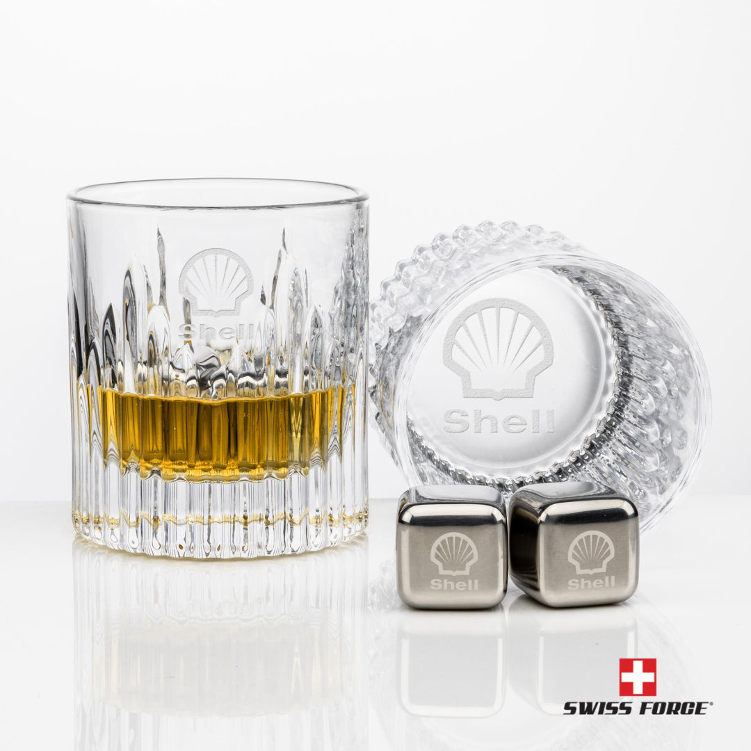 Caldari on-the-rocks glasses are elegantly paired with a set of four stainless steel ice cubes, designed to keep your drink perfectly chilled without dilution. Presented in a luxurious satin-lined gift box, this sophisticated set combines timeless style and practicality, making it an impressive gift for any occasion.OTR capacity: 8.5ozSet of 18/8 Stainless Steel ice cubes chill longer than regular iceFood grade, gel-filled cubes are a non-diluting substitute to iceKeep drinks, beverages and fine liquor cold without losing flavorPlace cubes in the provided pouch and freeze for about 4 hoursNo freezer burn, taste or smell like regular ice and no messy leakingSet of 4 cubes with natural canvas pouch in magnetic closure gift boxThese reusable cubes are long-lasting and an expression of pure elegance