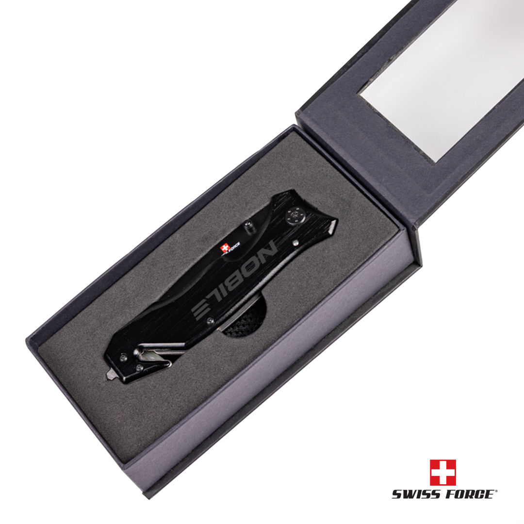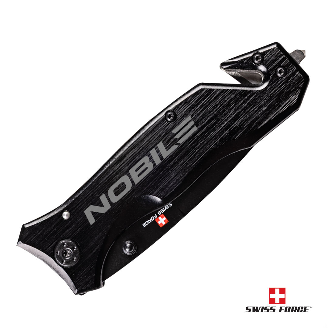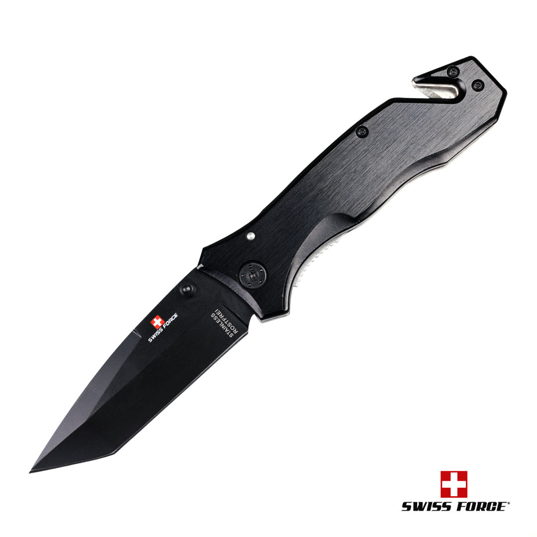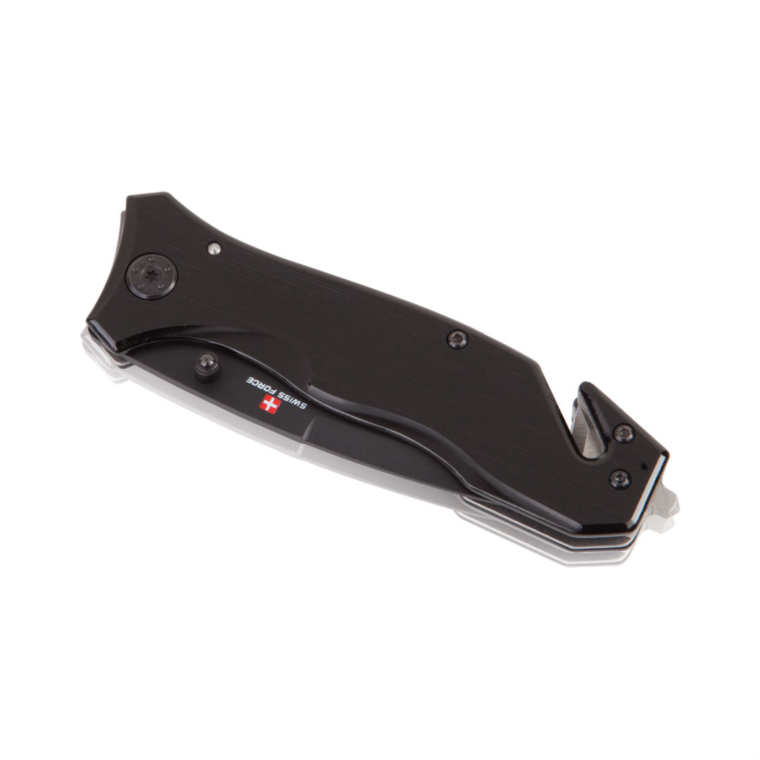 Stainless steel pocket knife and auto emergency tool- Rust and stain proof- Multi-tool includes; black stainless steel blade, emergency window breaker and seat belt cutter- Brushed and textured black coating- Secure, lock-back functionality- Utility belt clip for accessibility