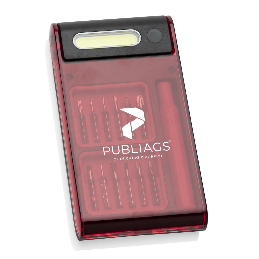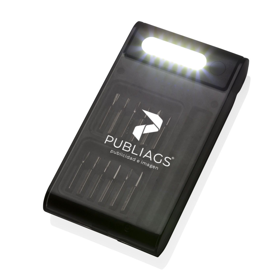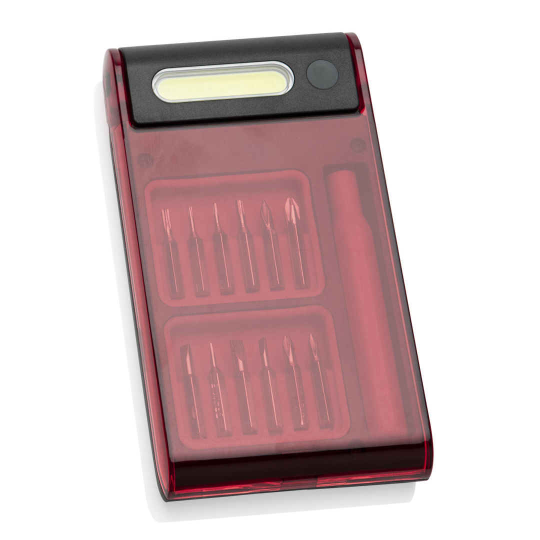 Toolsmith MultiTool Set with advanced Super Bright COB LED light. Complete set features…-Screwdriver Handle-12 bits Including…-Phillips 00, 0, 1, 2-Slotted 1.5mm, 2mm, 3mm, 3.5mm-Torx T4, T6, T8, T10-Ultra Bright COB LED light with 2 settings, Always on or flashing SOS Strobe light. Product Size: 2.625″ x 5″ x 0.75″. 2.625″ W x 5.0″ H x 0.75″ D
