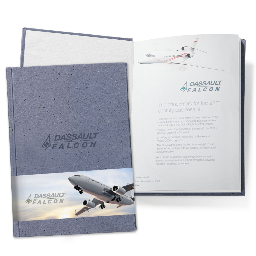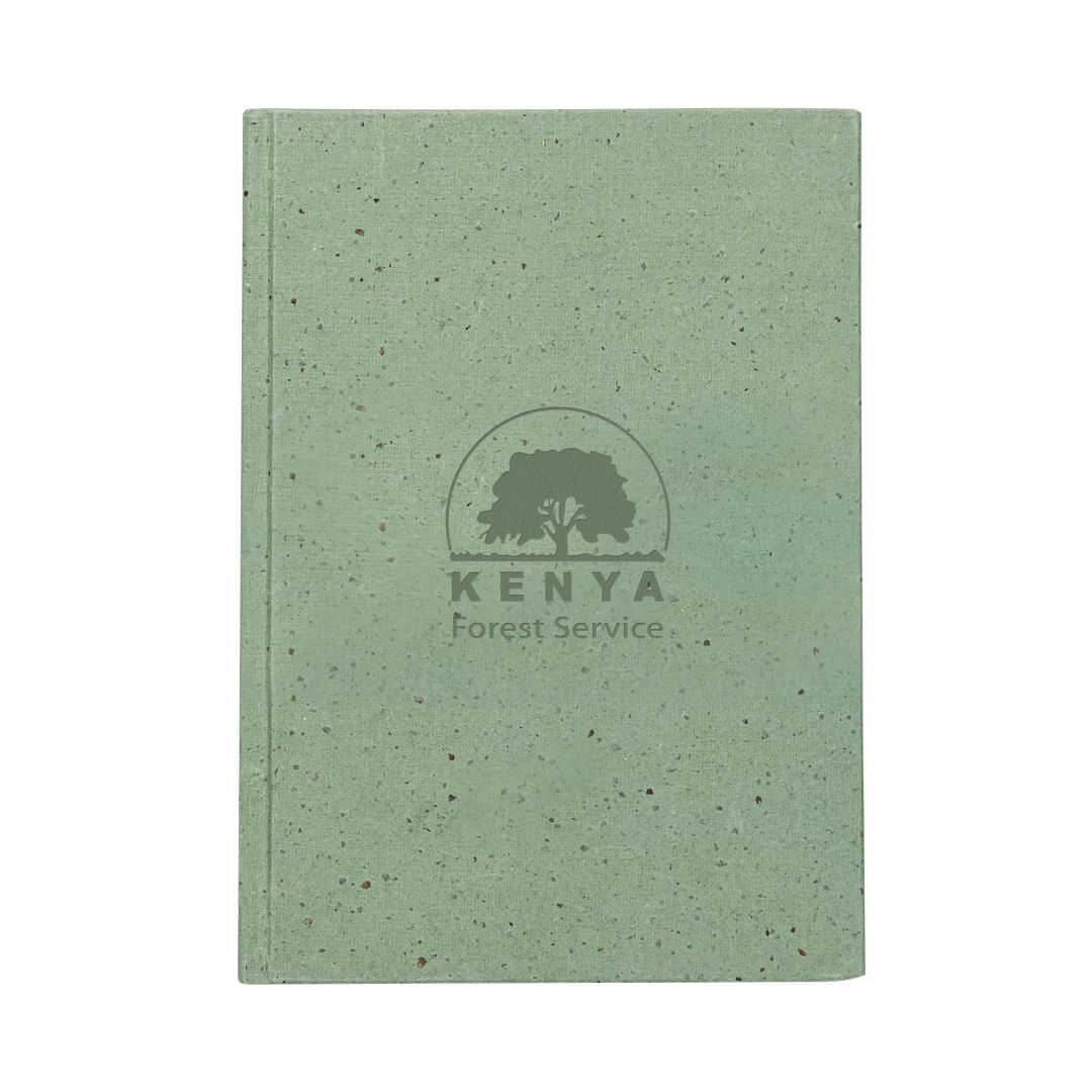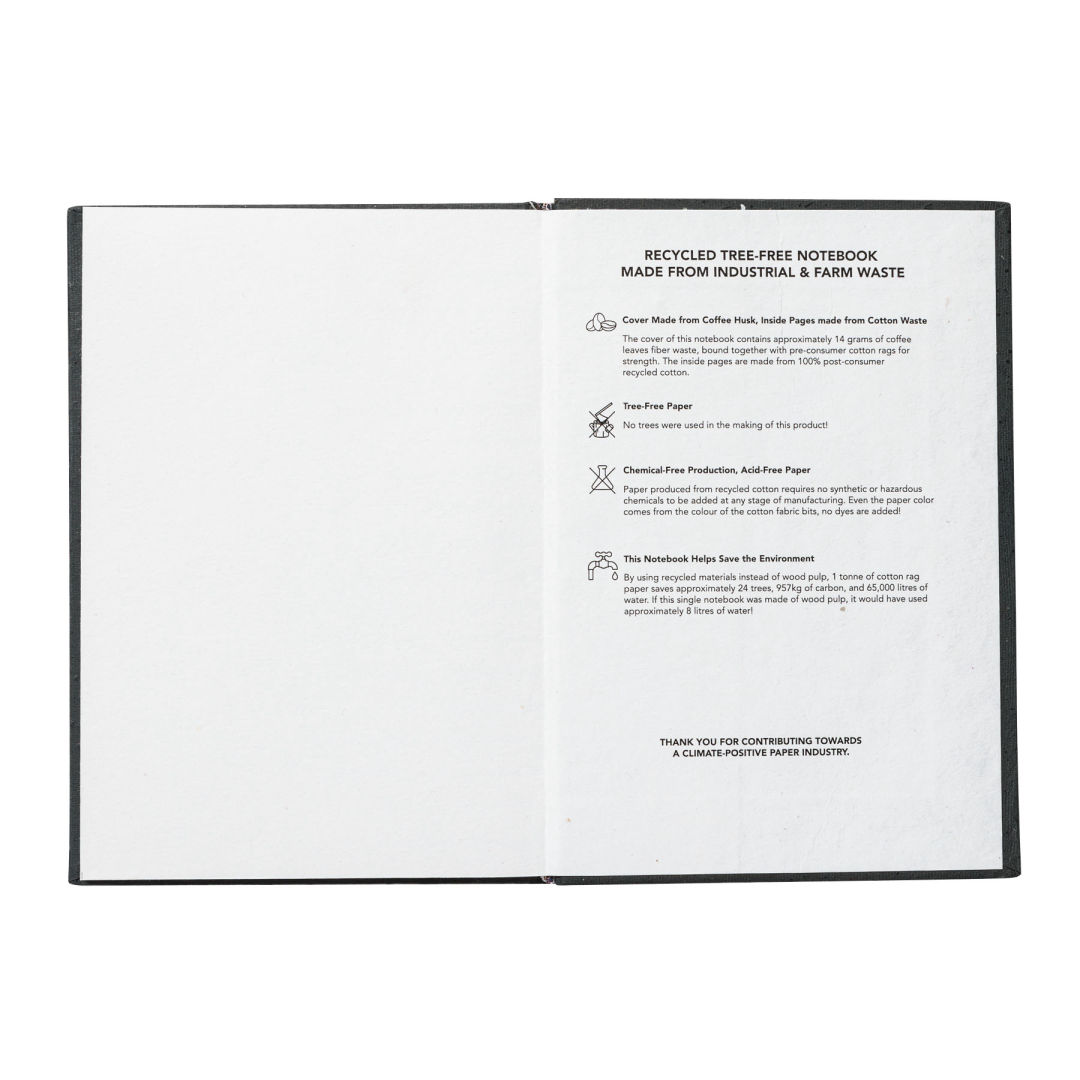 The Tree Free Hardcover Notebook w/Belly Band is a remarkable fusion of sustainability and artistry! This notebook not only offers you a canvas to capture your thoughts and ideas but also embodies a compelling eco-conscious narrative that redefines what stationery can be.A distinctive cover made from 14 grams of coffee husk offers a unique texture while the inside pages are made from 100% post-consumer recycled cotton rags (GRS Certified) for strength making it durable and biodegradable. Features also include acid-free paper and chemical-free production. No trees were harmed in the making of this product! Notebook includes 100 pages. *Belly Band & Promo Page Inserts Optional. See Decorating Info for details. 5.75″ W x 8.125″ H x 0.625″ D
