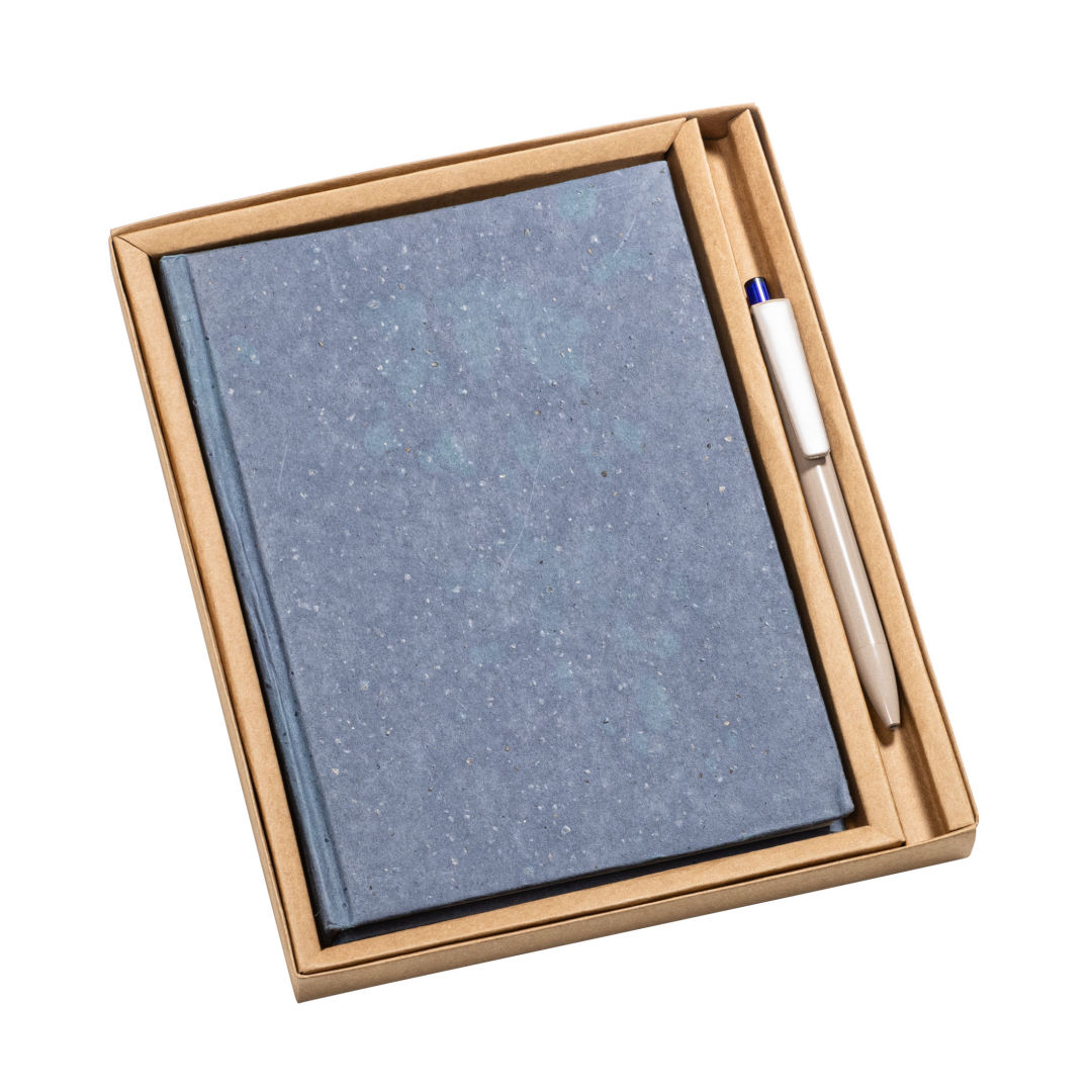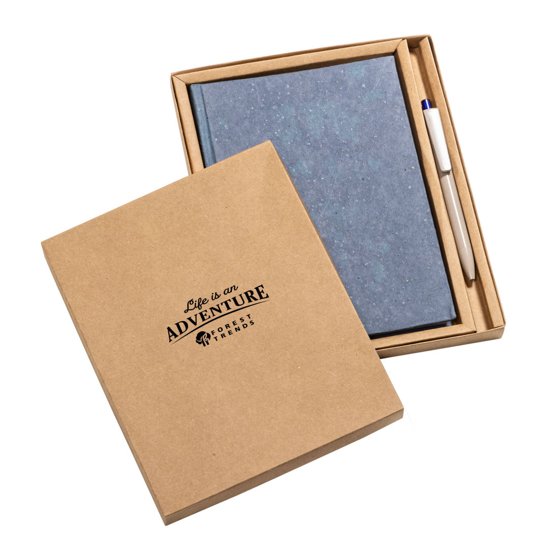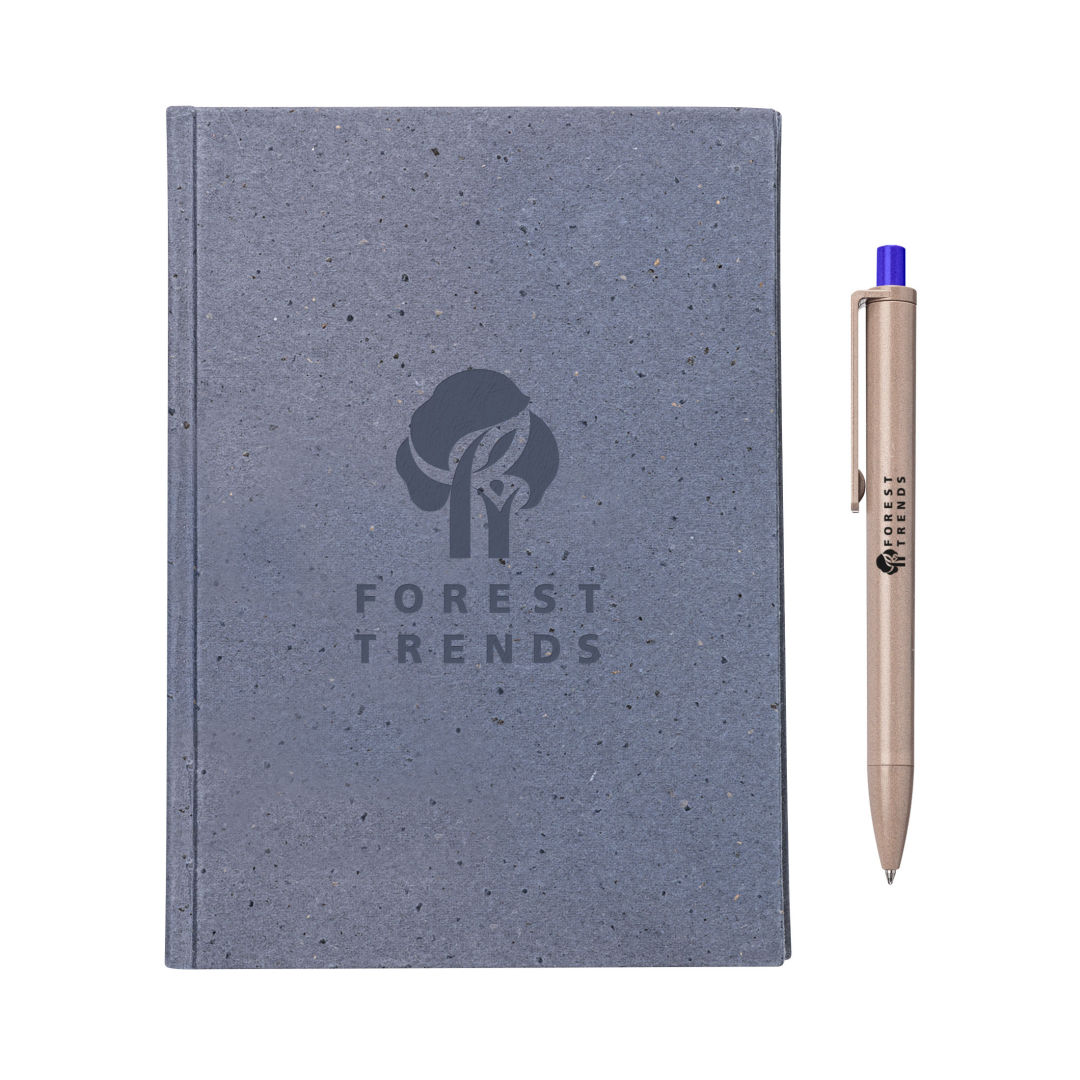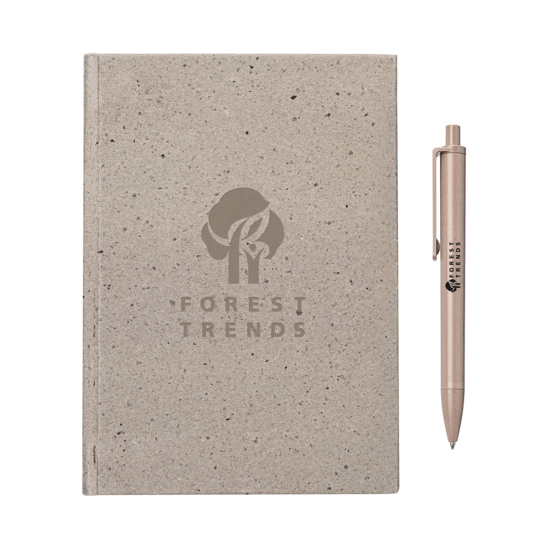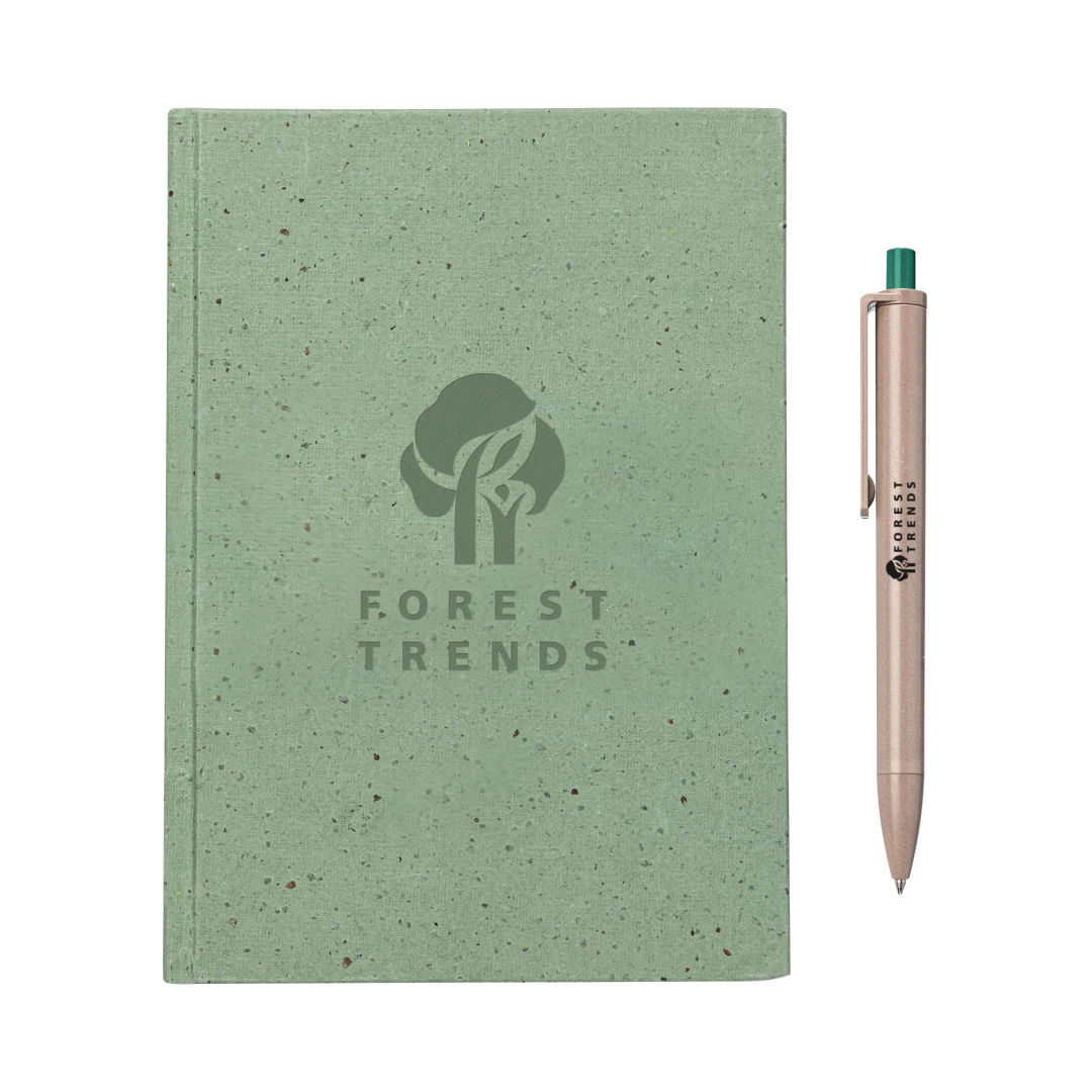 The Tree Free Notebook is paired with the Ritter Algo Pen, made from all-natural biodegradable brown algae found in our oceans. This eco-friendly combination makes one incredible eco gift set! The Tree Free Hardcover Notebook features a distinctive cover made from 14 grams of coffee husk offers a unique texture while the inside pages are made from 100% post-consumer recycled cotton rags (GRS Certified) for strength making it durable and biodegradable. Also features also include acid-free paper and chemical-free production. No trees were harmed in the making of this product!Notebook includes 100 pages.*Belly Band & Promo Page Inserts Optional. See Decorating Info for details. 5.75″ W x 8.125″ H