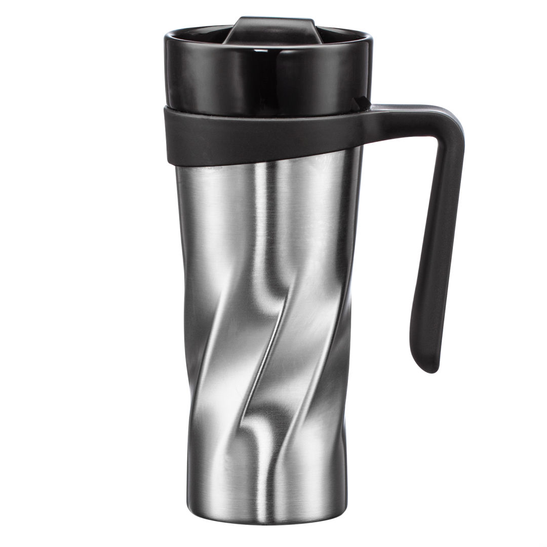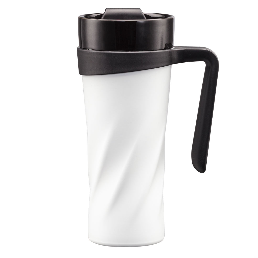 The Trocadero Travel Mug is your new favorite companion when on-the-go!- Ceramic-lined 13.5oz mug with uniquely designed twisted body- Secure screw-on lid with flip-top closure – Easy grip handle for convenient carry- Fits most cupholders. 3.0″ W x 7.5″ H