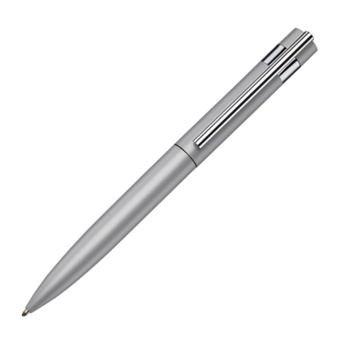 Metal twist action ballpoint pen with chrome trim and soft rubber touch coating. (White excluded).