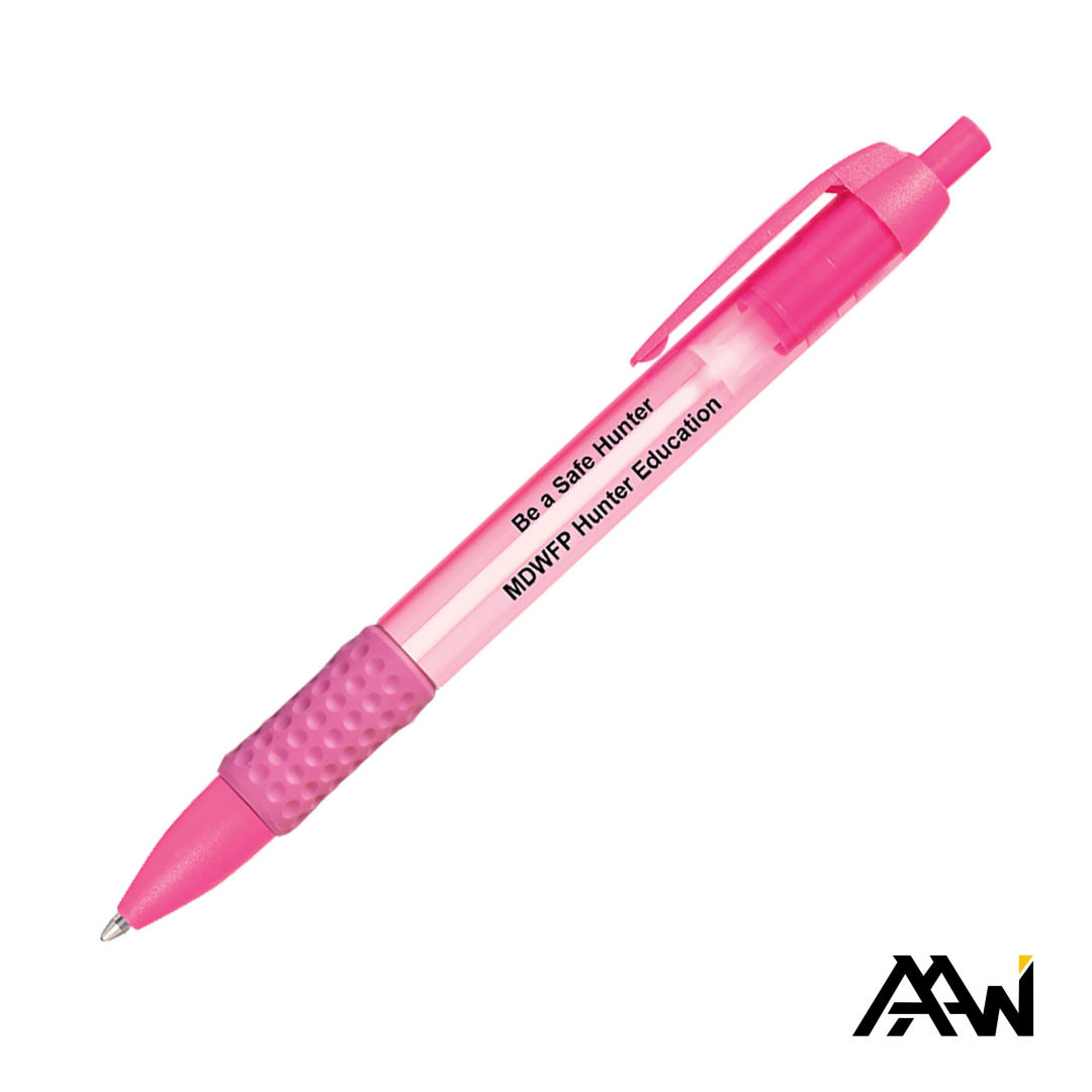 This Jumbo Retractable Pen features a sleek transparent gloss barrel accented with matching transparent matte trim for a modern, polished look. Its bold, oversized design ensures a comfortable grip and smooth writing experience, perfect for everyday use or promotional giveaways. Available in a variety of vibrant translucent colors, it’s an eye-catching way to showcase your brand or message. Black ink.Pen Size: 5.5″ W x 0.4″ H. 5.5″ W x 0.45″ H