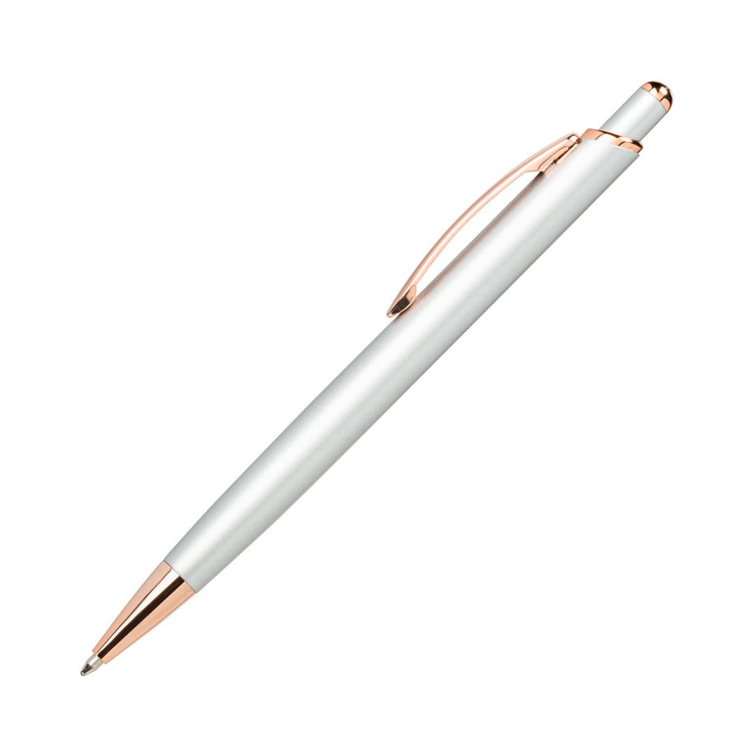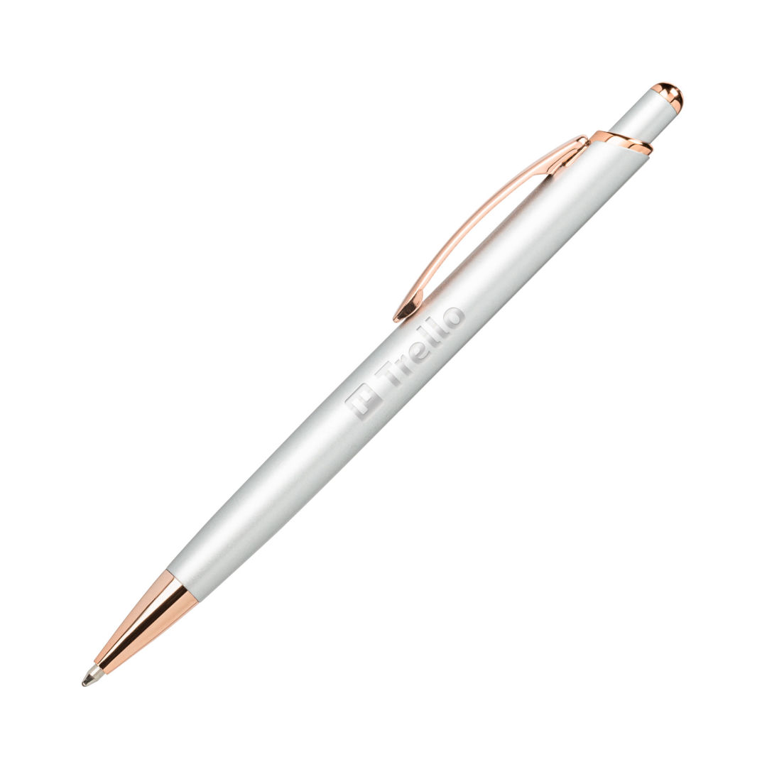 The Witman Rose Gold Accent Clicker Pen is meticulously crafted for those who appreciate both style and substance. Featuring a top push button, steel clip, and an aluminum barrel, this pen combines sleek design with impeccable functionality. Product Size: 5.5″ W x 0.5″ H. 5.5″ W x 0.375″ H